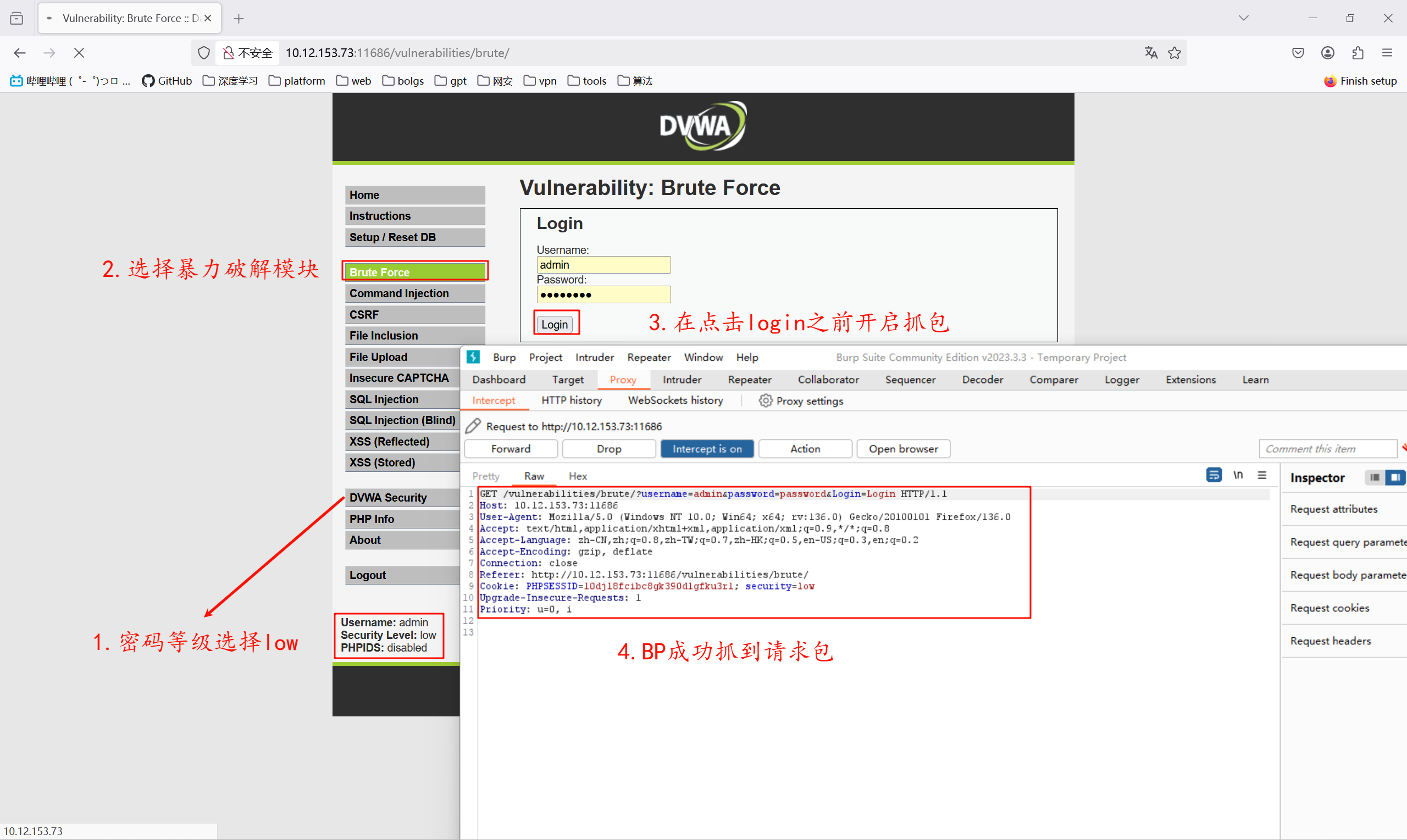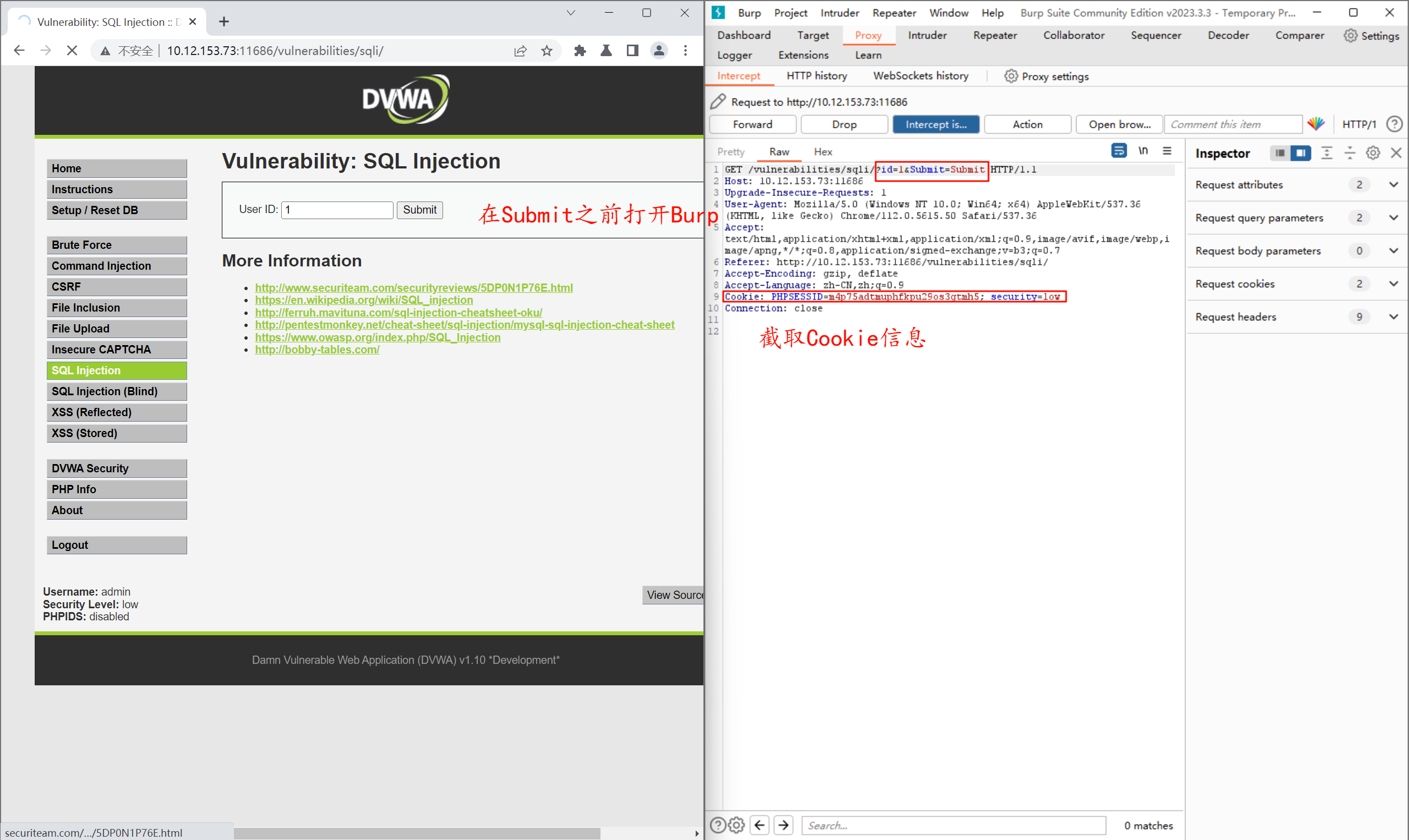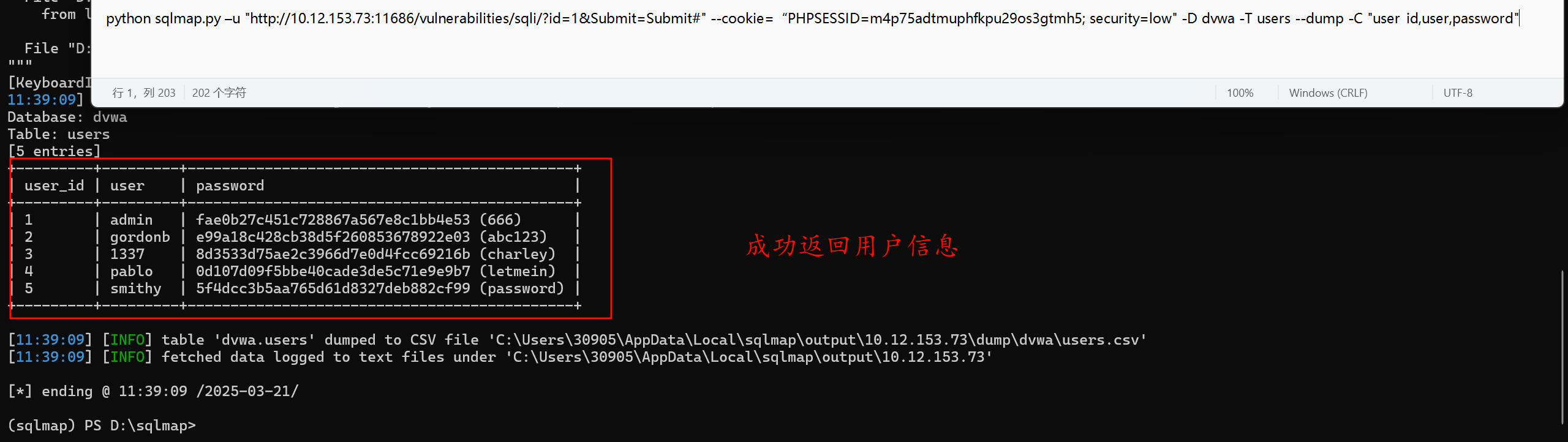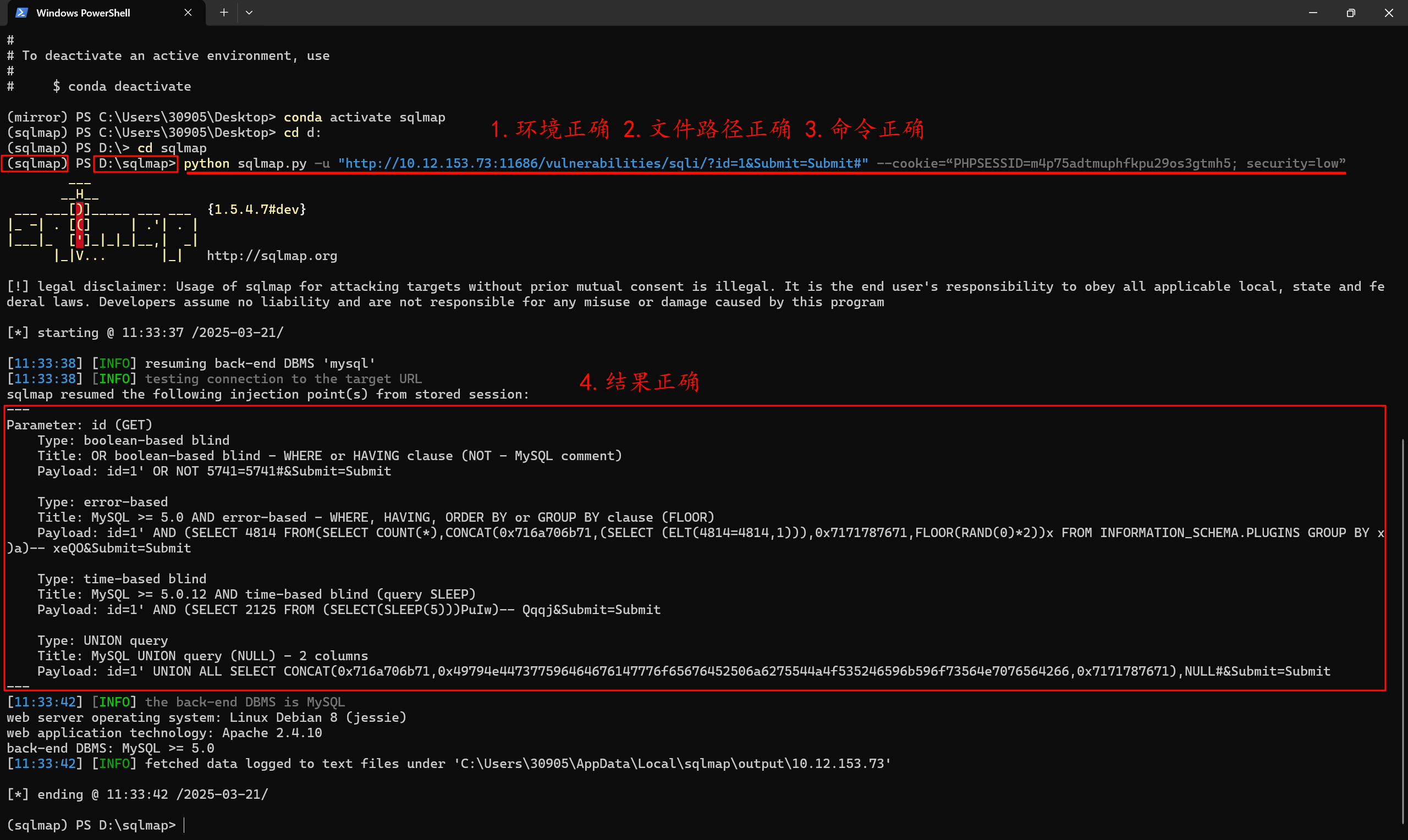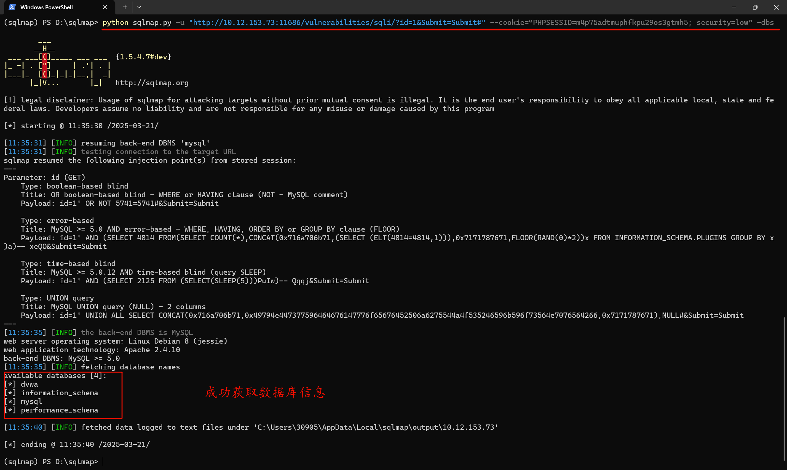 例如python sqlmap.py –u "http://10.12.153.73:11686/vulnerabilities/sqli/?id=1&Submit=Submit#" --cookie=“PHPSESSID=m4p75adtmuphfkpu29os3gtmh5; security=low"