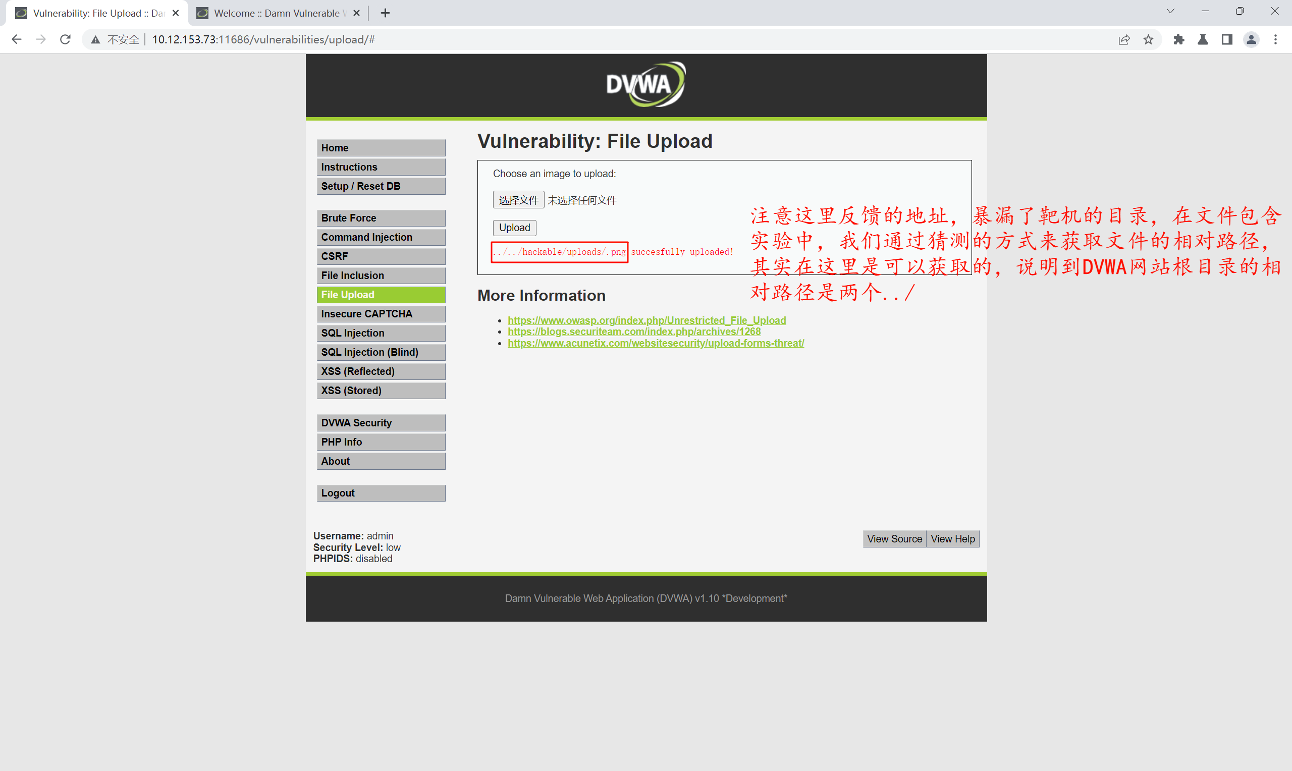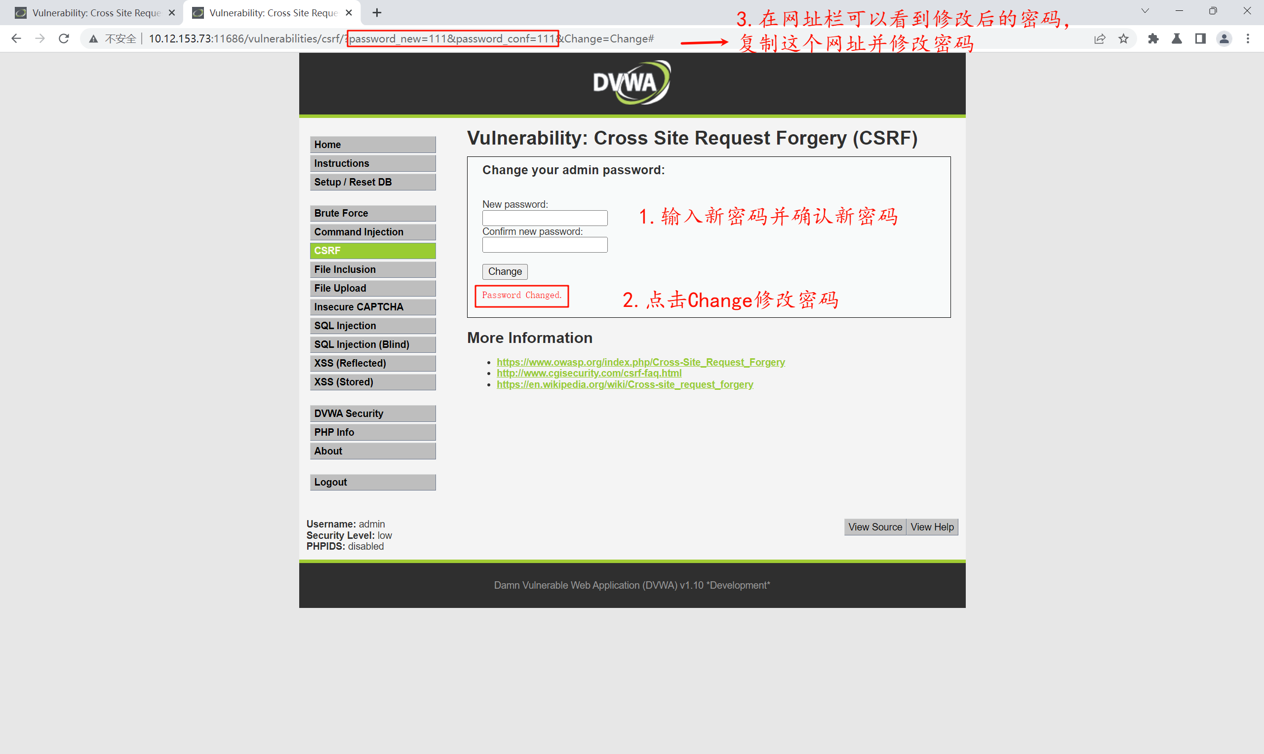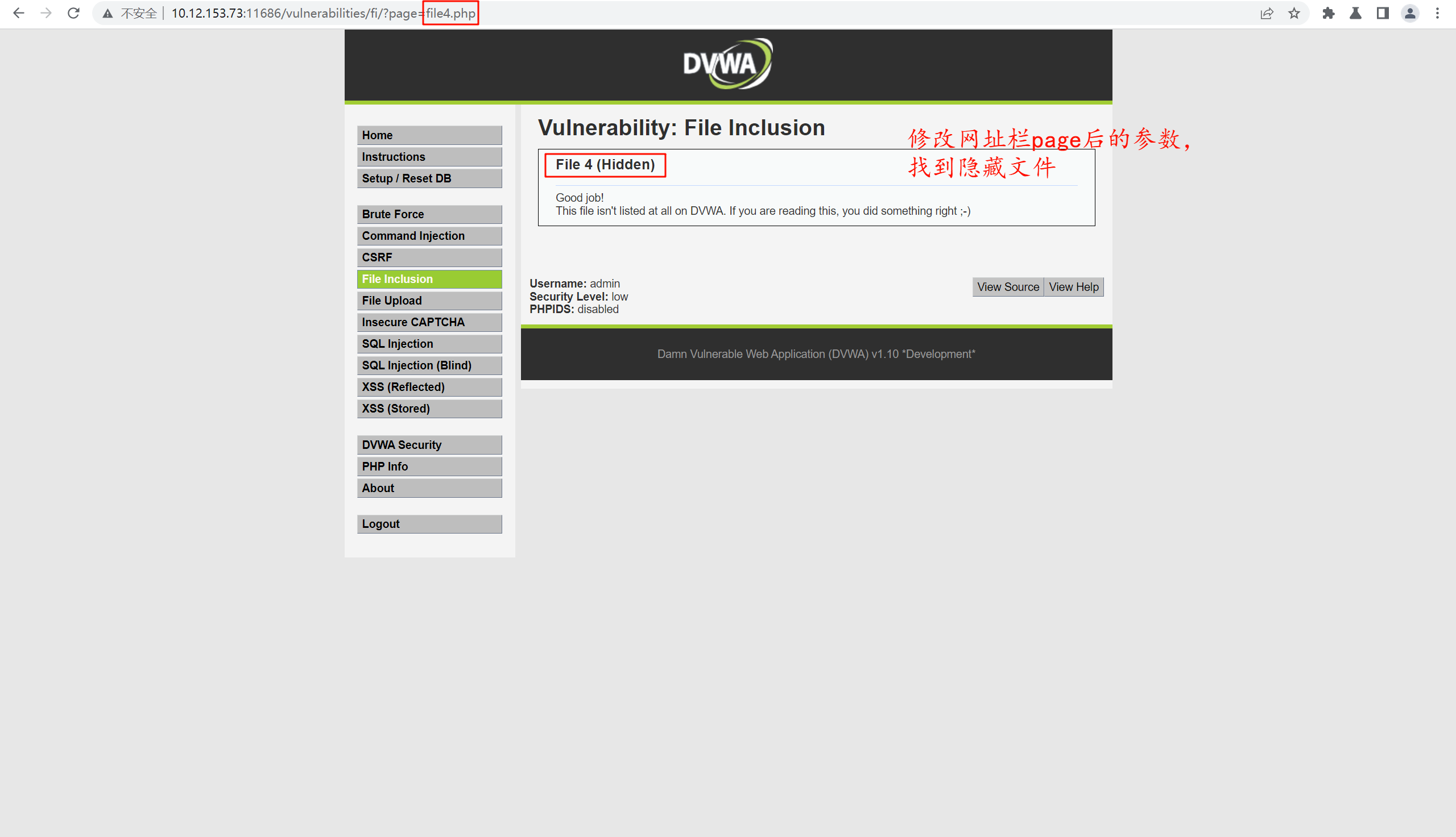 在跨站请求伪造环节,我尝试着将page后的参数改为file4.php,可是并没有发现隐藏文件,多次刷新也没有结果,周围同学部分成功、部分结果和我一样找不到文件。后来在QQ群聊中有同学提示密码的等级要修改成low,最终成功解决问题。