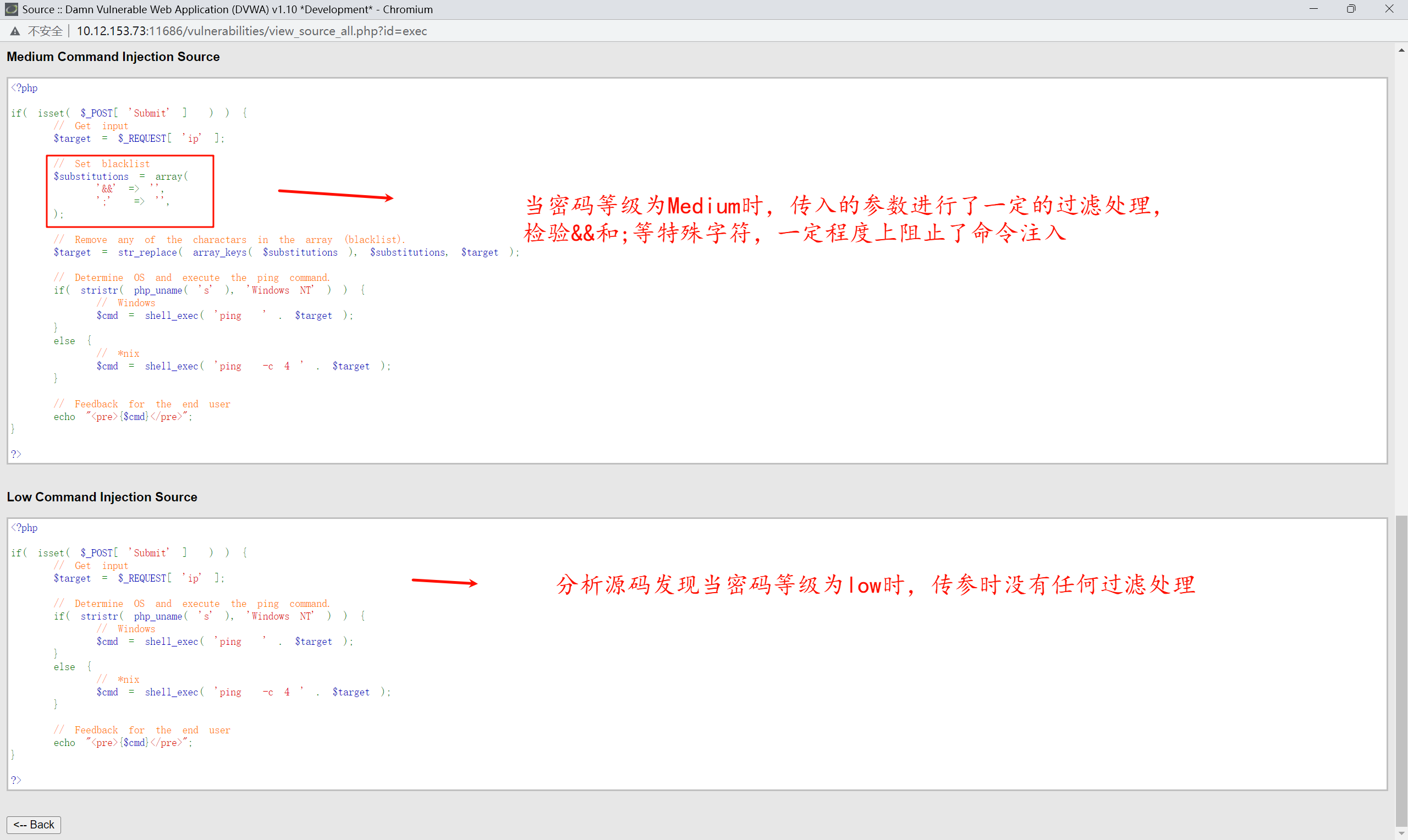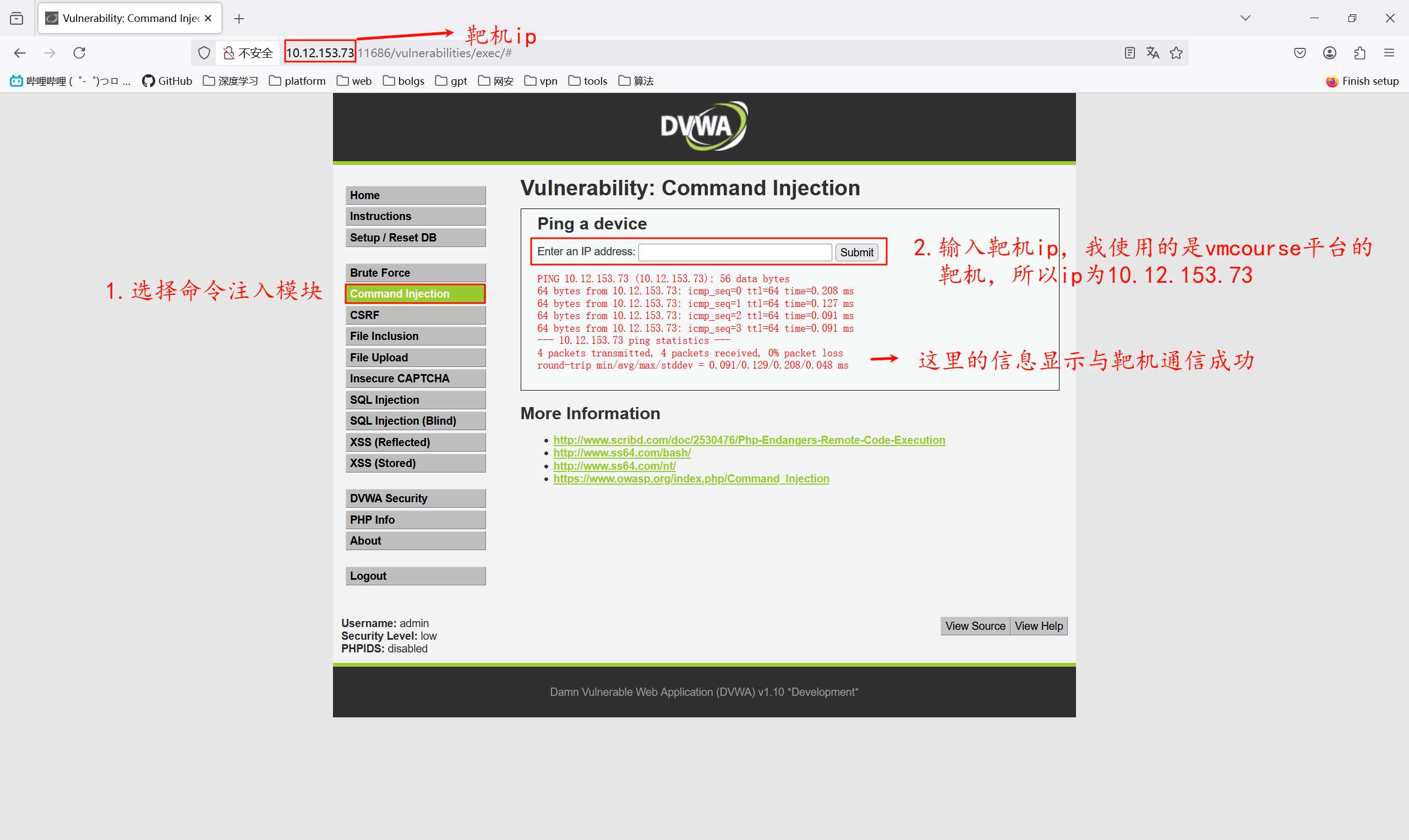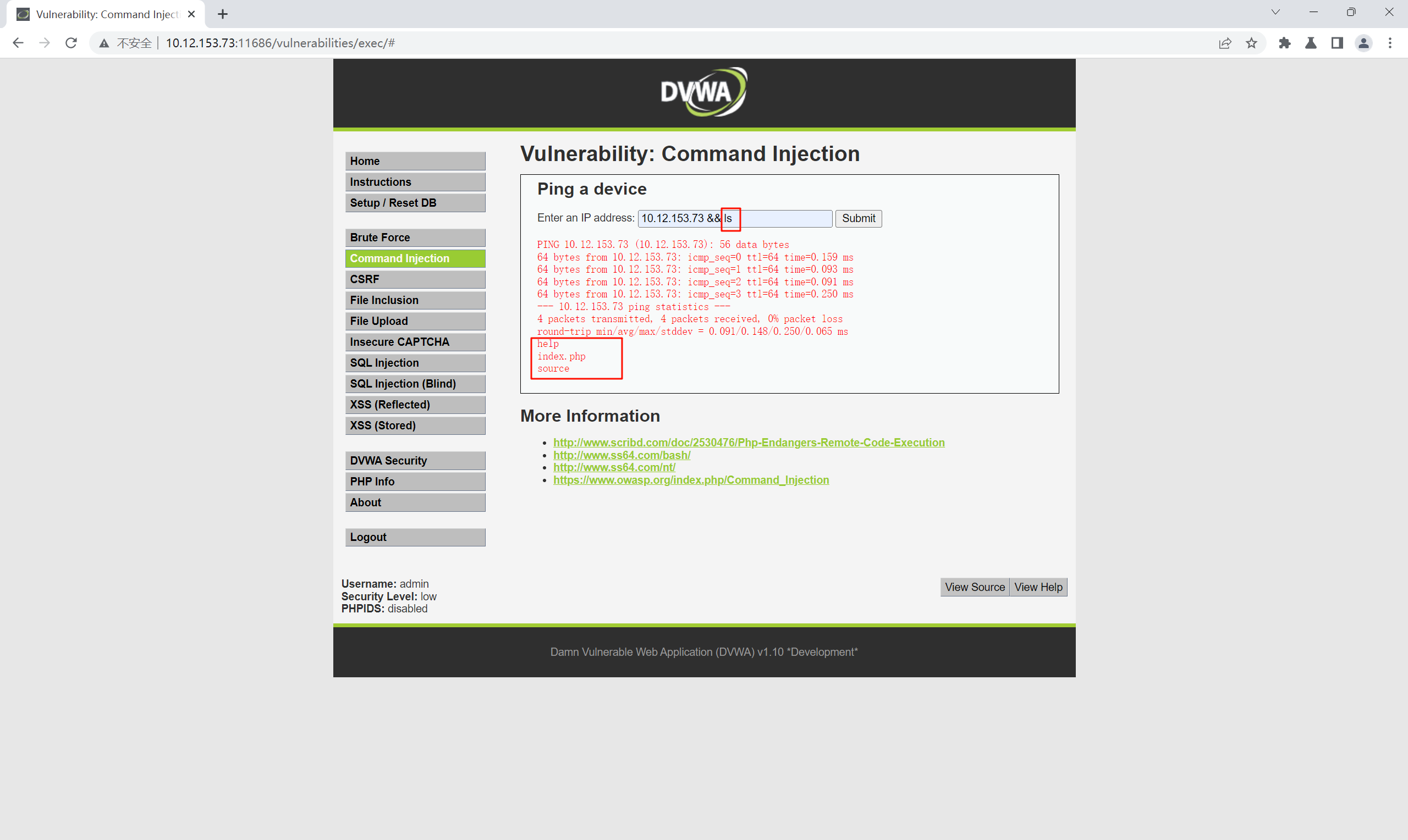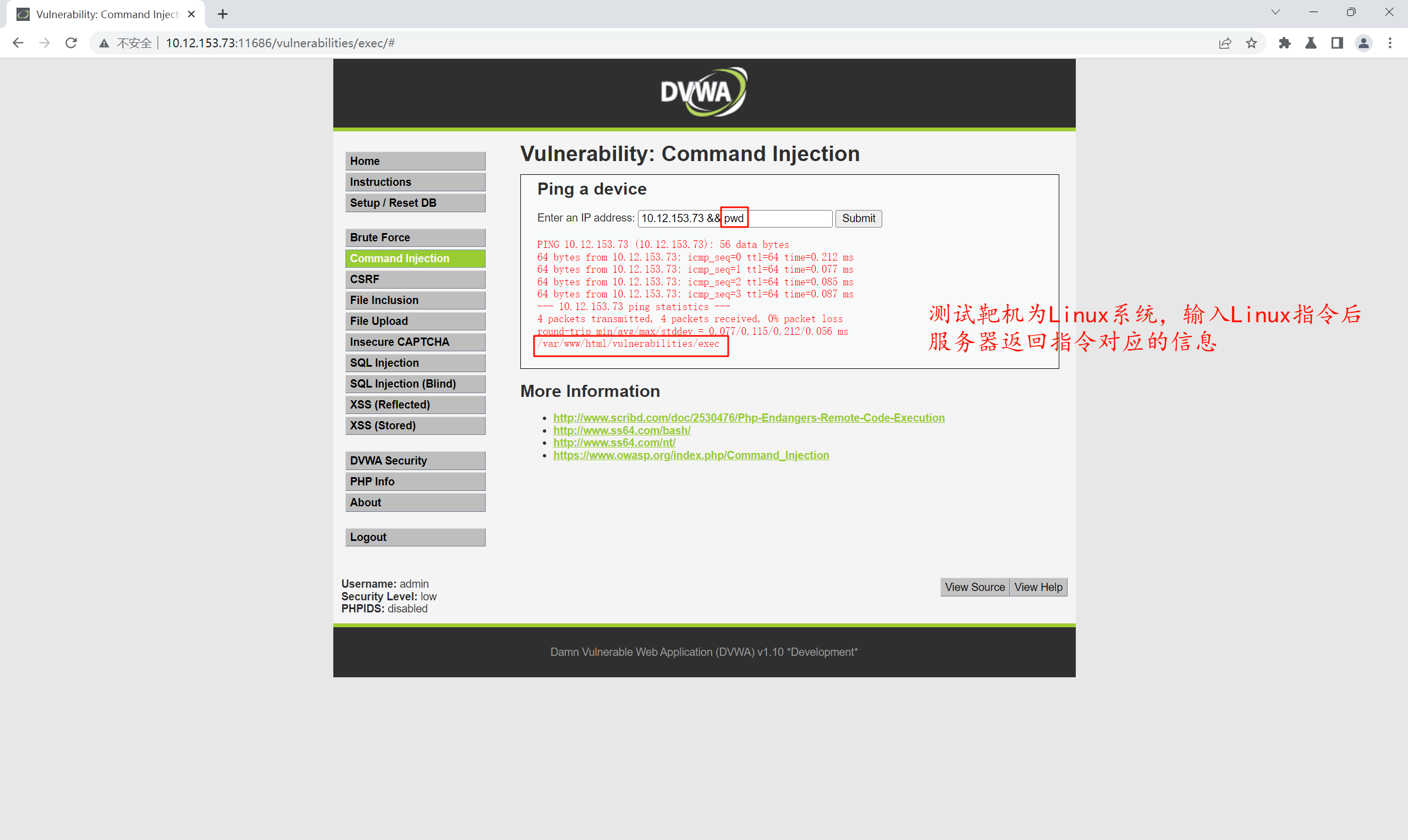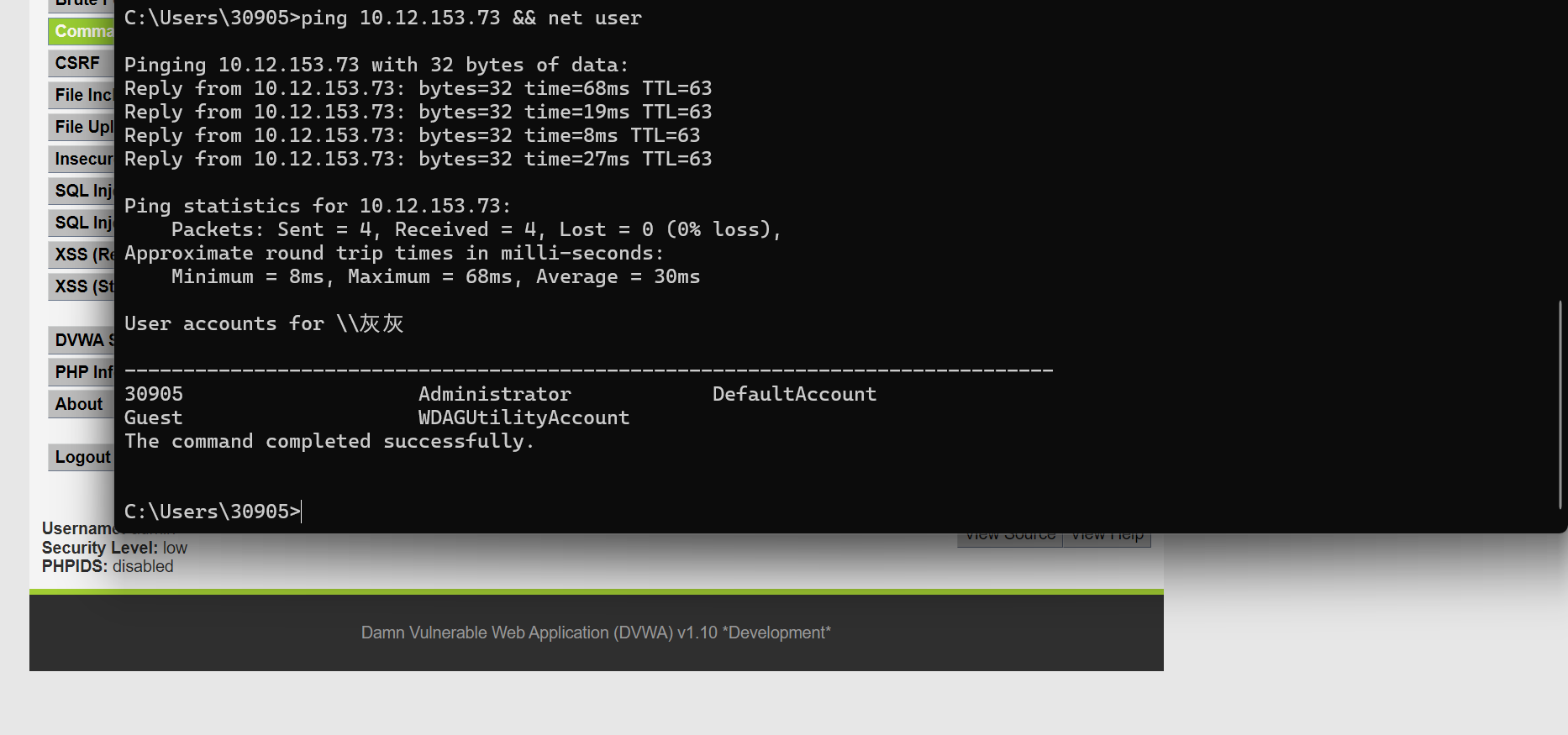在命令注入环节,我尝试使用“ping 靶机ip && net user”命令获取靶机信息,可是只返回了ping的结果,没有返回net user的结果,后来在PPT上看到Windows系统和Linux系统的指令有所区别,猜测学校靶机为Linux服务器,于是将&&后的命令改为ls,pwd等Linux命令,成功返回正确信息。