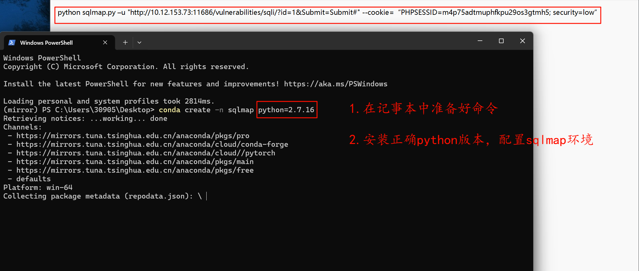 在SQL注入环节,运行sqlmap程序时python版本过低,许多同学遇到python版本无法切换的问题,这里给出三个小方法,第一是修改环境变量,将低版本的python的bin路径放在高版本的前面,这样计算机会先运行低版本的python。第二是使用conda管理python版本,通过”conda create -n sqlmap python=2.7.16”可以安装指定版本的python解释器,并很好地解决了环境冲突问题。第三是在GitHub官网下载最新版本的sqlmap,及时更新资源包中sqlmap的版本,而不去下载较低版本的python解释器。